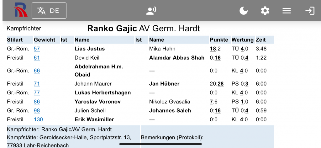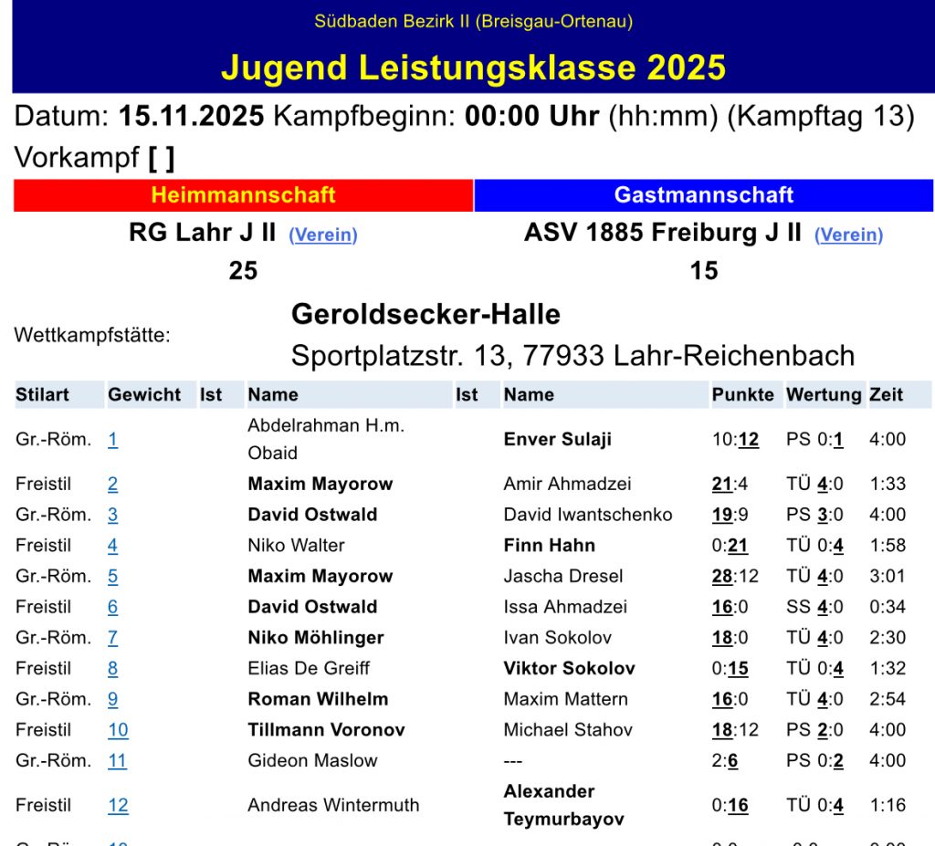 Am vergangenen Samstag traten alle drei Mannschaften bei der RG Lahr an. In der Jugend kam zu insgesamt 11 Begegnungen. Auf unserer Seite waren Enver Sulaji, Finn Hahn, Viktor Sokolov und Alexander Teymurbayov erfolgreich. Unsere 2. Mannschaft kann derzeit die Ausfälle nicht kompensieren und trat leider nur zu fünft an. Dementsprechend war der Kampf bereits beim Gang über die Waage entschieden. Der Freundschaftskampf entdete 17:11 für Lahr. Für uns waren Abbas Shah, Jan Hübner und Johannes Saleh erfolgreich. Im Hauptkampf blieb es spannend bis zum Schluss. Beide Mannschaften konnten jeweils fünf Einzelduelle mit dem exakt gleichen Ergebnis für sich entscheiden und somit ging das Endergebnis unentschieden aus. In der Klasse bis 57 kg musste sich Mika Hahn vorzeitig auf Schulter geschlagen geben. Im Schwergewicht fuhr unser Trainer Michael Kaufmehl einen technisch überhöhten Sieg ein. Bis 66 kg ging der Kampf von Ivo Dimov über die volle Zeit und er sicherte sich einen klaren Punktsieg. In der Klasse bis 98 kg schulterte Maxi Remensperger seinen Gegner noch in der ersten Kampfhälfte. Bis 66 kg gingen die Punkte kampflos an Lahr, da Jan Hübner mit Überegwicht antreten musste. Nach der Pause unterlag Olegk Motsalin im Limit bis 86 kg nach Punkten. Bis 71 kg musste sich Alish Alish technisch überhöht geschlagen geben. Den Rückstand in der Mannschaftswertung holten Mo Damnkhoshk und Daoud Issayev aber souverän auf. In der Tabelle belegen wir weiterhin Platz 5 mit Luft nach unten und leider auch nach oben. Am 22.11.2025 tritt unsere 1. Mannschaft in der Bundschuhhalle gegen die WKG Weitenau-Wieslet an. Kampfbeginn ist um 20 Uhr.