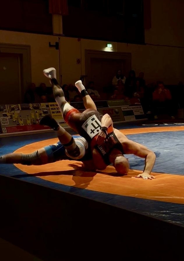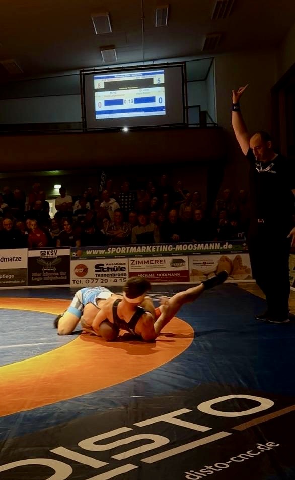 David Brenn sorgte mit schnellen Beinangriffen für die nächste klare Viererwertung zugunsten der Gastgeber. Die Umstellung in dieser Gewichtsklasse sollte sich aus unserer Sicht noch bewähren. Im Halbschwergewicht überrumpelte Maxi Remensperger seinen Gegner und übertrug diesen nach einem ansehnlichen Überwurf. Der augenscheinlich angeschlagene Luca Svaicari konnte sich aus der misslichen Lage nicht mehr befreien und unterlag überraschend auf Schulter. Nun zu der zuvor erwähnten taktischen Umstellung. Ivo Dimov trat in der Klasse bis 66 kg stilartfremd gegen David Langenbacher an. Ein Schachzug, mit dem die Gastgeber mutmaßlich nicht gerechnet haben. Und die Rechnung ging mit einem technischen Überlegenheitssieg von Ivo Dimov vollumfänglich auf. In der Klasse bis 86 kg Olegk Motsalin gewann ein zähes, körperbetontes 86-kg-Duell und zeigte viel taktisches Gespür. Auch Alish Alish überzeugte im Kampf gegen den starken Leon Schetterer, der zwar mutig agierte, sich aber am Ende knapp geschlagen geben musste. Tennenbronn meldete sich durch den schnellen Schultersieg von Fabian Reiner zurück. Somit stand es vor den beiden letzten Kämpfen 12:12 in der Mannschaftswertung. Doch Mo und Daoud bewiesen Nervenstärke. Mohammad Damnkhoshk und anschließend Daoud Issayev entschieden die beiden 75-kg-Kämpfe mit maximaler Punkteausbeute und machten den Gesamtsieg perfekt. Am Ende bleibt ein sportlicher Abend mit großem Einsatz beider Teams. Tennenbronn behauptet Platz drei und zeigt trotz Niederlage, warum es zur Spitzengruppe gehört. Wir sammeln wichtige Moral für die kommenden Aufgaben und bleiben stabil auf Rang fünf.