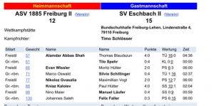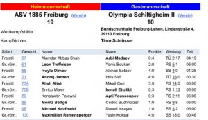 Unsere Jugend grüßt weiter von der Tabellenspitze. Gegen den ASC Kappel setzten sie sich deutlich mit 27:9 durch. Hierbei sorgten Maximilian Eryganov, Viktor Sokolov, Alexander Teymurbayov, Jaron Neff, Dario Eifler, Finn Hahn und Danil Mai für unsere Mannschaft erfolgreich. Unsere II. Mannschaft unterlag knapp dem SV Eschbach II. Alamdar Abbas Shah, Evan Wissler, Nikoloz Gvasalia und Kniaz Kaloiev sicherten dabei die Mannschaftspunkte für unser Team. Unsere I. Mannschaft setzte ihre Siegesserie fort und gewann auch gegen Olympia Schiltigheim II mit 19:10. Leon Treffeisen, Ivaylo Dimov, Andrej Janzen, Alish Alish, Moritz Bettge, Michael Kaufmehl und Maximilian Remensperger waren für unser Team erfolgreich. Am kommenden Wochenende ringt unsere 1. Mannschaft bereits am Freitag Abend beim VfK Mühlenbach. Kampfbeginn ist um 20:30 Uhr. Den Vorkampf bestreiten die Jugendmannschaften beider Vereine.