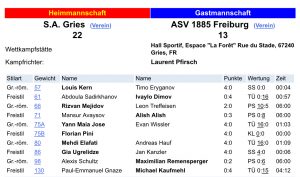 Am Samstag trag unsere Jugend zum Spitzenkampf in der Bezirksjugendliga beim KSV Hofstetten an. Dabei galt es die Tabellenspitze zu verteidigen. Und das ist mehr als gelungen. Mit einem fulminanten 20:9 Sieg traten unsere Nachwuchsgriffkünstler die Heimreise an. Für uns waren Maximilian Eryganov, Laurin Neff, Luca Eifler, Erik Gillert, Emilian Neff, Dario Eifler und Jan Hübner erfolgreich. Unserer 1. Mannschaft bleibt zumindest momentan das Pech treu. Leider mussten weitere Athleten verletzungsbedingt absagen, so dass wir nur eine Rumpftruppe ins Rennen schicken konnten. Vor allem in der zweiten Kampfhälfte konnten die Hausherren aufholen und schlussendlich den Mannschaftskampf für sich entscheiden. Für unser Team waren Ivaylo Dimov, Alish Alish, Maximilian Remensperger und Michael Kaufmehl siegreich. Am Samstag starten alle drei Mannschaften in der Bundschuhhalle. Die Jugend beginnt den Kampfabend um 17:30 Uhr gegen die RG Lahr. Anschließend folgt der Kampf unserer zweiten Mannschaft gegen den AC Gutach-Bleibach II und der Hauptkampf unserer ersten Mannschaft gegen den TSV Kandern.