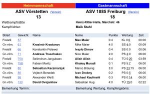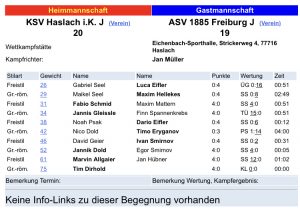 Am kommenden Samstag findet der erste Heimkampf für unsere Aktiven statt in der Bundschuhhalle in FR-Lehen statt. Um 19 Uhr tritt unsere Reserve gegen den ASC Kappel an. Um 20 Uhr kommt es zum Hauptkampf unserer ersten Mannschaft gegen den KSV Wollmatingen. Unsere Jugend muss zunächst nochmals auswärts in Lahr antreten. Kampfbeginn für unsere Nachwuchsgriffkünstler in Lahr ist um 18 Uhr.