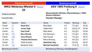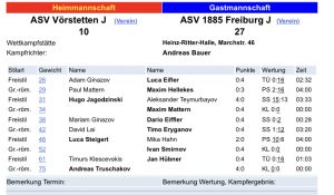 Unsere Jugendmannschaft konnte sich am Tag der Deutschen Einheit deutlich bei der Jugend vom ASV Vörstetten durchsetzen. In der Endabrechnung hieß es 27:10 für unsere Nachwuchsgriffkünstler. Unsere Aktiven müssen leider weiter mit einer Durststrecke kämpfen. Unsere II. Mannschaft unterlag deutlich bei der starken Regionalligareserve Weitenau-Wieslet II. Unsere I. Mannschaft unterlag überraschend bei Lutte Selestat mit 24:10. Bereits am kommenden Wochenende gibt es den nächsten Heimkampf bei uns in der Bundschuhhalle. Ab 18 Uhr tritt unsere Jugend gegen den Nachwuchs der RG Waldkirch-Kollnau an. Ab 19 Uhr tritt dann unsere II. Mannschaft gegen die RG Waldkirch-Kollnau an. Ab 20 Uhr findet der Hauptkampf unserer 1. Mannschaft gegen die Überraschungsmannschaft S.A. Gries an. Für spannende Begegnungen ist also gesorgt. Kommt vorbei und unterstützt unsere Mannschaften.