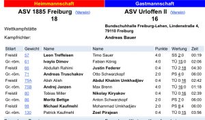 Im Hauptkampf kam es zum Aufeinandertreffen der beiden noch ungeschlagenen Mannschaften vom ASV Urloffen II und unserer I. Mannschaft. In der Klasse bis 57 kg machte Leon Treffeisen kurzen Prozess und drückte seinen Gegner nach wenigen Sekunden auf beide Schulterblätter. Im Schwergewicht musste sich Patrick Kaufmehl dem starken Zoel Pirjean technisch überhöht geschlagen geben. Ivaylo Dimov konnte nach überstandener Erkältung wieder ins Kampfgeschehen eingreifen und sicherte einen ungefährdeten technisch überhöhten Punktsieg. Den wohl spannendsten Kampf lieferten sich Michael Kaufmehl und der starke Mohammed Umkhadjiev im Halbschwergewicht. Der Gastringer zeigte sich völlig unbeeindruckt vom namhaften Gegner und verlangte unserem Michel alles ab. Nach der vollen Kampfdistanz konnte Michel seine ganze Routine in einen knappen Punktsieg verwandeln. Ein toller Kampf von beiden Seiten. In der Klasse bis 66 kg wehrte sich Abdullah Rahimi gegen Justin Federer nach Leibeskräften, er konnte jedoch eine technisch überhöhte Niederlage nicht verhindern. Moritz Bettge kochte für die Klasse bis 86 kg GR ab, was sich auszahlen sollte. Gegen Anton Schwarzkopf sicherte er einen klaren Punktsieg für unsere Mannschaft. Andreas Truschakov konnte seinen ersten Sieg für unsere Mannschaft vor heimischem Publikum einfahren. In der Klasse bis 71 kg lieferte er sich einen spannenden Kampf gegen Otto Schwarzkopf und gewann knapp nach Punkten. Tobi Miller konnte in der Klasse bis 80 kg gegen Nikolay Kiryakov leider nichts entgegensetzen und verlor technisch überhöht. In der Klasse bis 75 kg A musste Alish Alish erstmals eine empfindliche Niederlage gegen Abdul Khakim Umkhadjiev hinnehmen. Gegen den starken Urloffener war an diesem Abend nichts zu holen. Andrej Janzen bewies sich einmal mehr als Matchwinner und sicherte im letzten Kampf den Mannschaftssieg mit einem technisch überhöhten Punktsieg gegen Max Brenn. Unsere Mannschaft grüßt nunmehr vom Sonnenplatz in der Tabelle.