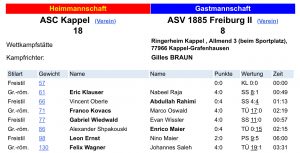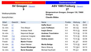 Unsere I. Mannschaft trat beim SV Gresgen an und sorgte für einen Erfolgsmoment. Mit 27:9 konnten wir die Gresgener in Schach halten. Haffiz Noori siegte kampflos in der Klasse bis 57 kg. Michael Kaufmehl musste sich dem Gresgener Sieggaranten Boris Novadze hauchdünn nach Punkten geschlagen geben. Leon Treffeisen gewann in der Klasse bis 61 kg auf Schulter. Marco Bräunig war Daniel Wimberger stilartfremd klar unterlegen. Ivaylo Dimov fuhr einen ungefährdeten Punktsieg ein. Moritz Bettge rückte auf 86 kg GR, was sich mit einem technisch überhöhten Punktsieg auszahlen sollte. Auch Andi Truschakov siegte technicht überhöht. Auf 80 kg FR gingen die Punkte kampflos an die Gastgeber. Die beiden letzten Einzelduelle konnten unsere Athleten Alish Alish und Andrej Janzen überzeugend für sich gestalten. Am 14.10.2023 findet der nächste Heimkampf in der Bundschuhhalle statt.