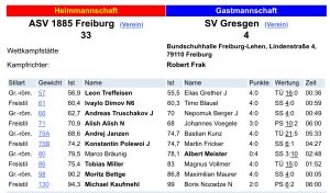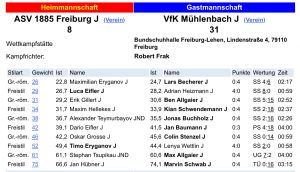 Am letzten Wochenende trat unsere Jugend zum Spitzenduell gegen den Spitzenreiter der Bezirksjugendliga in der Bundschuhhalle an. Dass die Mühlenbacher zurecht an der Tabellenspitze stehen, sollte sich im Kampfverlauf leider deutlich zeigen. Im bisherigen Saisonverlauf mussten sich unsere Nachwuchsgriffkünstler bislang lediglich dem VfK Mühlenbach im Hinkampf geschlagen geben. Leider war uns auch im Rückkampf das Glück nicht hold und so setzten sich die Gäste deutlich mit 31:8 durch. Wir gratulieren dem VfK Mühlenbach zur verdienten Meisterschaft in der Bezirksjugendliga. Unsere 1. Mannschaft hatte ja beim letzten Kampf in Urloffen den Meistertitel in der Verbandsliga vorzeitig gesichert. Aber die Feierlaune wirkte sich nicht auf die Wettkampfeinstellung unserer Athleten aus. Gegen den in der Rückrunde noch ungeschlagenen SV Gresgen zeigte unsere 1. Mannschaft mal wieder eine Topleistung mit Sahnehäubchen. In der Endabrechnung setzten sich 9 von 10 unserer Ringer in den Einzelduellen durch, was für die Gäste eine deutliche Niederlage bedeutete. Am 02.12.2023 tritt unsere 1. Mannschaft um 20 Uhr in Wollmatingen an. Unsere Jugend kämpft um 19 Uhr gegen die RG Waldkich-Kollnau J / ASV Vörstetten J an. Bitte beachtet, dass der Jugendkampf in der Heinz-Ritter-Halle in Vörstetten stattfindet.