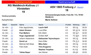 Denkbar knapp unterlag unsere Jugendmannschaft beim Rückkampf gegen die RG Waldkirch-Kollnau J / ASV Vörstetten J mit 19:18. Damit gelang den Gastgebern die Revanche für den Hinkampf, in welchem wir uns mit noch mit 22:9 deutlich durchsetzen konnten. Die Niederlage war leider sehr unglücklich, aber an diesem Samstag war unseren Nachwuchsgriffkünstlern das Glück nicht hold. Für die Mannschaftspunkte auf unserer Seite sorgten Laurin Neff, Alexander Teymurbayov, Mika Hahn, Timo Eryganov und Stephan Tsupikau. Unsere Jugendmannschaft belegt trotz der Niederlage weiterhin den 2. Tabellenplatz in der Bezirksjugendliga.
