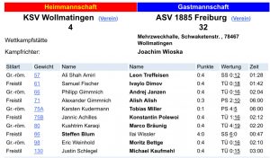 Unsere 1. Mannschaft fuhr dagegen einen Kantersieg beim KSV Wollmatingen ein. In der Klasse bis 57 kg sicherte Leon Treffeisen einen ungefährdeten Schultersieg. Im Schwergewicht dominierte unser Trainer Michael Kaufmehl den Kampf nach Belieben und gewann technisch überhöht. Auch Ivo Dimov, Moritz Bettge und Andrej Janzen überzeugten jeweils mit einem technisch überhöhten Sieg und verbuchten wir zur Halbzeit bereits die Maximalausbeute bei der Mannschaftswertung. Im seinem ersten Kampf in der 1. Mannschaft musste unser Nachwuchsringer Ilai Wissler Lehrgeld zahlen und unterlag dem starken Steffen Blum auf Schulter. Den ersten Kampf über die volle Kampfzeit boten Alexander Gimmnich und Alish Alish. Hier setzte sich Alish Alish nach Punkten durch. Marco Bräunig gewann anschließend in der Klasse bis 80 kg GR wieder technisch überhöht. In der Klasse bis 75 kg kam es zum spannendsten Kampf des Abends. Tobi Miller lag nach der ersten Kampfhälfte mit 4:0 Punkten hinten und drehte in der zweiten Hälfte den Spieß um. Punkt für Punkt kämpfte er sich heran und gewann am Ende knapp mit 5:4. Im letzten Kampf des Abends gewann Konstantin Polewoi technisch überhöht. Unser Flaggschiff liegt nach wie vor unbesiegt und uneinholbar auf dem 1. Tabellenplatz vor Anker. Am 09.12.2023 findet um 20 Uhr der letzte Heimkampf unserer 1. Mannschaft in der Bundschuhhalle statt. Im Anschluss wollen dir die Meisterschaft in unserem Vereinsheim feiern. Seid dabei.