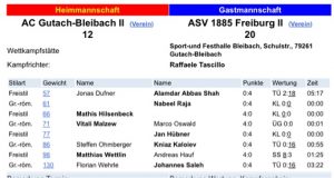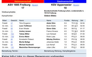 Unsere Ringer sind erfolgreich in die Saison gestartet. Die 1. Mannschaft setzte sich in der Oberliga gegen den KSV Appenweier mit 17:10 durch und die 2. Mannschaft erkämpfte sich bei dem AC Gutach-Bleibach einen 20:12 Auswärtssieg. Für unsere 2. Mannschaft waren Alamdar Abbas Sha, Nabeel Raja, Jan Hübner, Knias Kaloiev und Johannes Saleh mit jeweils 4 Mannschaftszählern erfolgreich. Unsere 1. Mannschaft trat gegen den letztjährigen Tabellendritten der Oberliga Südbaden an. Der Mannschaftskampf gestaltete sich in den ersten Kampfhälfte als sehr spannend. Unser Nachwuchsringer Timo Eryganov kämpfte mit Herz, musste sich aber technisch überhöht geschlagen geben. Im Schwergewicht sicherte unser Neuzugang Maxi Remensperger einen Punktsieg gegen Lulian Lifke. Leon Treffeisen machte gegen Bodo Ebelle kurzen Prozess und gewann technisch überhöht. In einem sehr spannenden Kampf im Halbschwergewicht bewies unser Ringertrainer Michael Kaufmehl gegen Leo Kempf wieder all seine Erfahrung und wendete das Blatt in den letzten Kampfsekunden knapp zu seinen Gunsten. Evan Wissler musste sich anschließend Sören Götz auf Schulter geschlagen geben. Nach der Pause boten Moritz Bettge und Johannes Kiefer den Zuschauern den nächsten spannenden Kampf über volle 6 Minuten. Auch hier konnte sich Moritz kurz vor Schluss die entscheidenden Punkte für sich verbuchen. Andrej Janzen fuhr im nächsten Kampf einen souveränen Sieg gegen Franco Kovacs ein. Konstantin Polewoi musste sich gegen den starken Appenweirer Neuzugang Nikolay Dimitrov beweisen. Konsti kämpfte aufopferungsvoll und rang dem Gegner in der zweiten Kampfhälfte nochmals Kampfpunkte ab, so dass er nur 0:2 nach Punkten verlor. Tobi Miller besiegte seinen Gegner Lion Kempel souverän auf Schulter und im letzten Kampf wurde den Zuschauern nochmals Spannung geboten. Hier konnte Enrico Maier seine Führung bis zum Schlussgong verteidigen und gewann knapp nach Punkten. Nächstes Wochendende müssen beide Mannschaften auswärts ran. Unsere 2. Mannschaft ringt in Moosch und unsere 1. Mannschaft in Radolfzell.